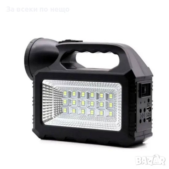 Соларната система е предназначена за използване при къмпингуване, ловно-риболовни излети, лагери, походи и др. където има нужда от осветление на няколко обекта, музика, а също и от зареждане на мобилни устройства като GSM, GPS, PS и др. Състои от соларен панел, фенер, прожектор, 3 LED лампи и кабел за зареждане на поратативни устройства. Лампите са оборудвани с ключове за пестене на ел. енергия. Фенера/прожектора могат да се зареждат от слънцето посредством соларния панел в комплекта или чрез USB порта. Има вграден акумулатор, три изхода (OUTPUT) за включване на осветителни LED лампи, един USB порт за зареждане на портативни устройства, вход за соларен панел, LED сигнализация.