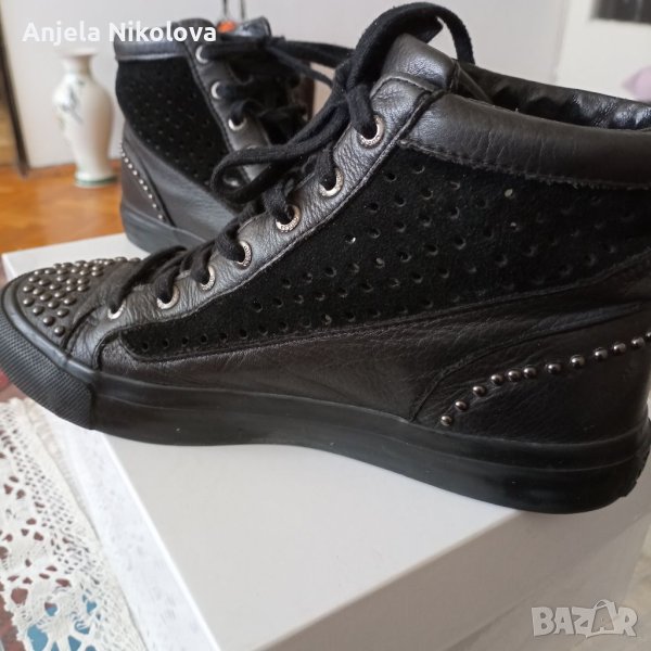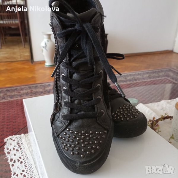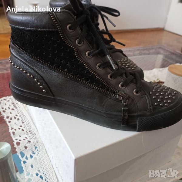 Сникърси GUESS, оригинални са. Естествена кожа и естествен велур отвън и естествена кожа отвътре. Циповете и подметката са брандирани с логото на марката. Без забележки са.