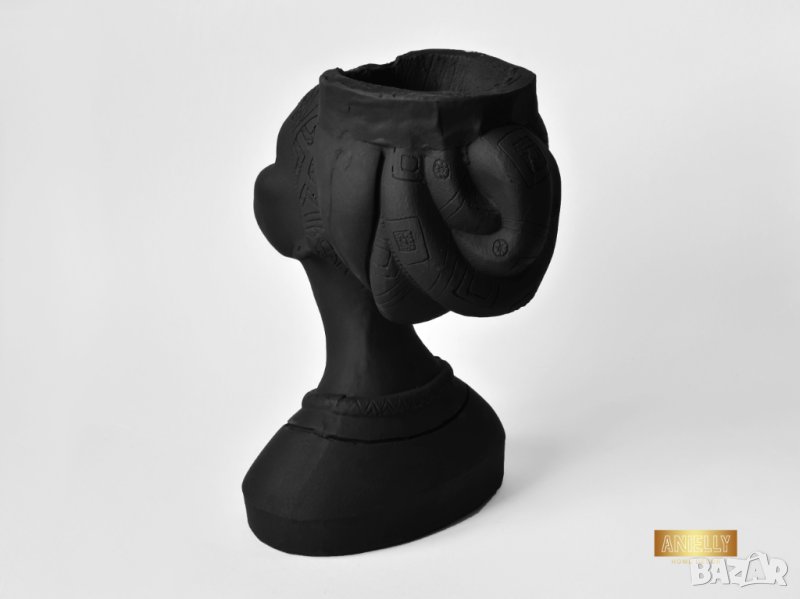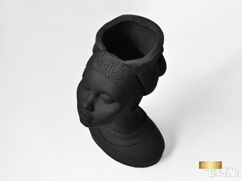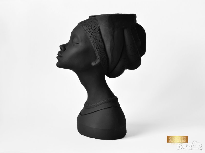 Този артукул представлява уникална кашпа под формата на бюст с лице на африканска жена. Елегантният дизайн с красив черен матов цвят и черен тюрбан с детайлни украшения подсилват модерния вид на кашпата. В нея могат да бъдат поставени изкуствени или естествени цветя, скандинавски мъх, сукуленти, свещи или гримове.
