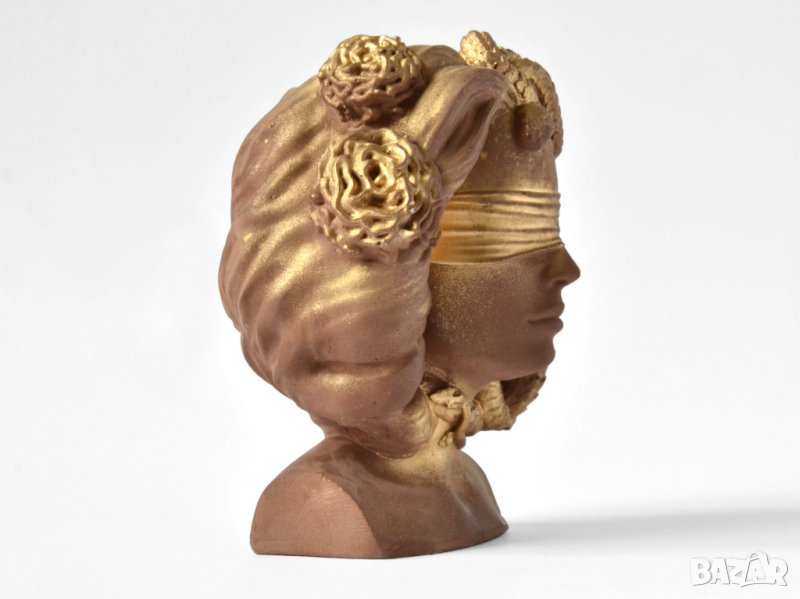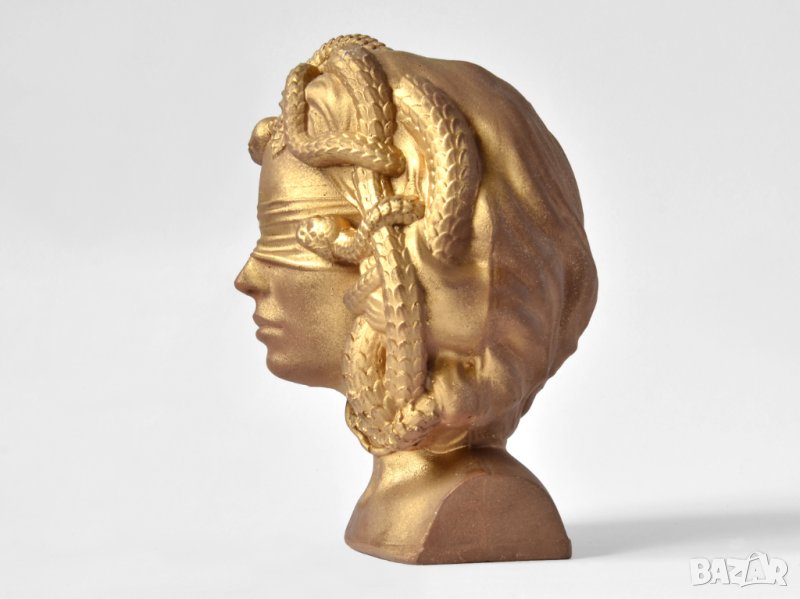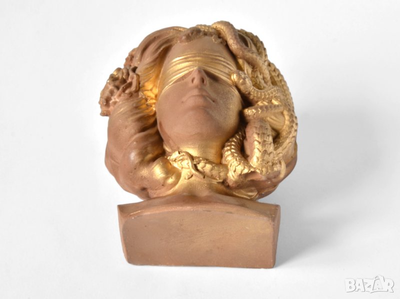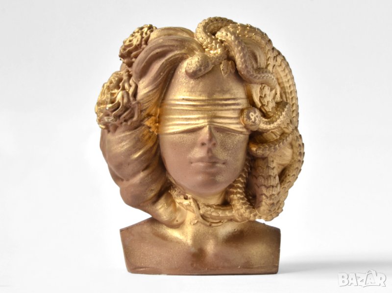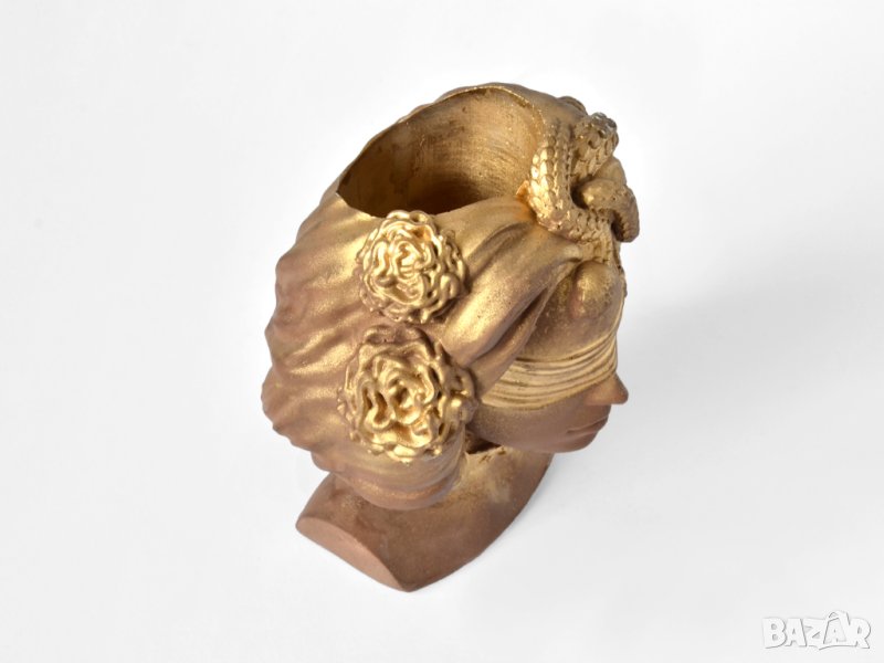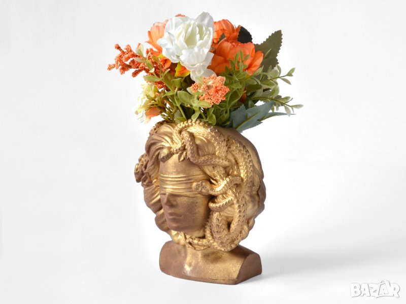 Този артукул представлява уникална ваза под формата на бюст с лицето на гръцката богиня Горгона Медуза. Елегантният дизайн с златен матов цвят и орнаменти с детайлни украшения подсилват модерния вид на вазата. В нея могат да бъдат поставени изкуствени или естествени цветя, скандинавски мъх, сукуленти, свещи или гримове.