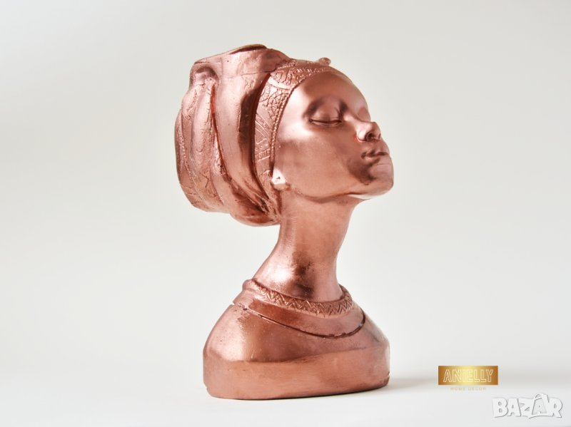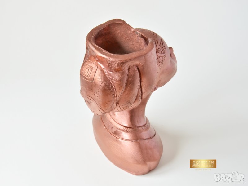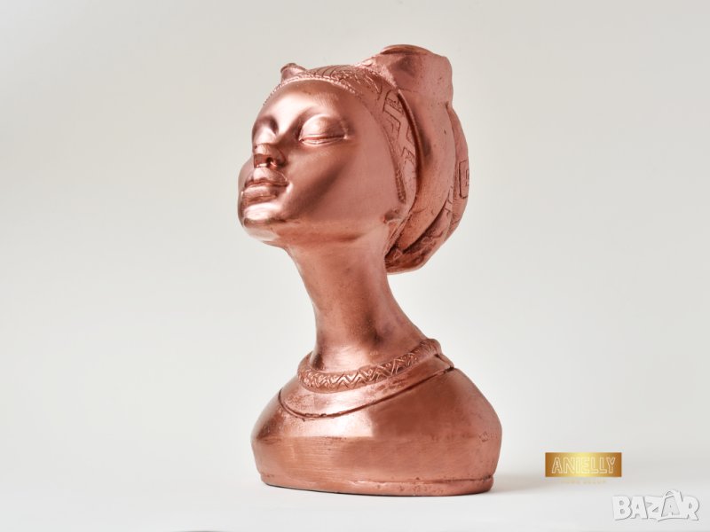 Този артукул представлява уникална кашпа под формата на бюст с лице на африканска жена. Елегантният дизайн с красив бронзов цвят и детайлни украшения подсилват модерния вид на кашпата. В нея могат да бъдат поставени изкуствени или естествени цветя, скандинавски мъх, сукуленти, свещи или гримове.
