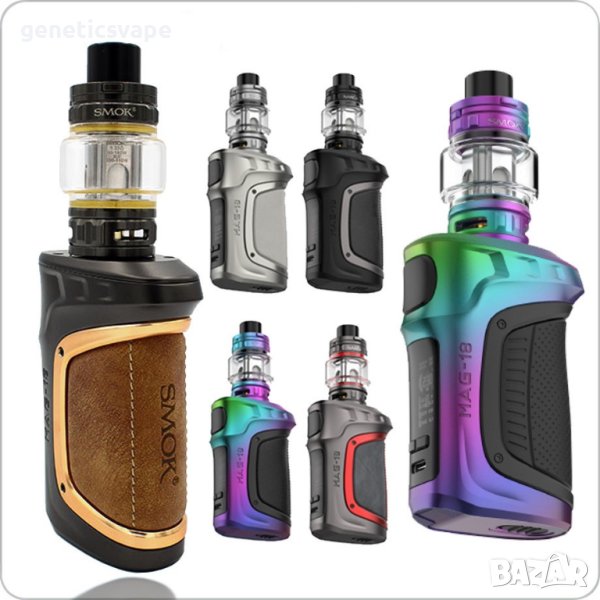 Комплектът SMOK Mag 18 се захранва от два броя батерии модел 18650 (не са включени в к-та, може да поръчате от меню категория батерии 18650), включващи 5-230 W изходна мощност, 0,96-инчов TFT екран с пълноцветен потребителски интерфейс и съхранява резервоара TFV18. Той е съвместим както с TFV18, така и с TFV16 Mesh Coil.Комплектът SMOK Mag 18 е проектиран за вейпъри с DL изпаряване.В зависимост от неговия lQ-X чип, той поддържа различни режими като захранване, TC (контрол на температурата), режим на байпас и може да се регулира до максимум 230 W. Резервоарът TFV18 е с диаметър 31,6 mm с резба 510 и се пълни отгоре.