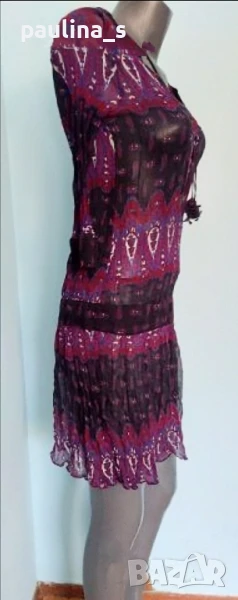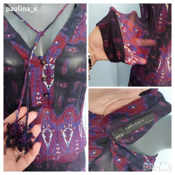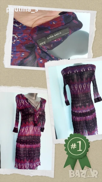 2️⃣. Колаж / M / 2XL - "Zara" basic. Цената е крайна 29,99лв / 15 евро. Една бройка, без дефекти и етикет. Уникална рокля от прозрачен шифон с еластичност и измачкан ефект. Маншетите на ръкавите и талията са с фиксиращи не еластични ленти. Нова е без дефекти, една бройка, става за посочените размери.