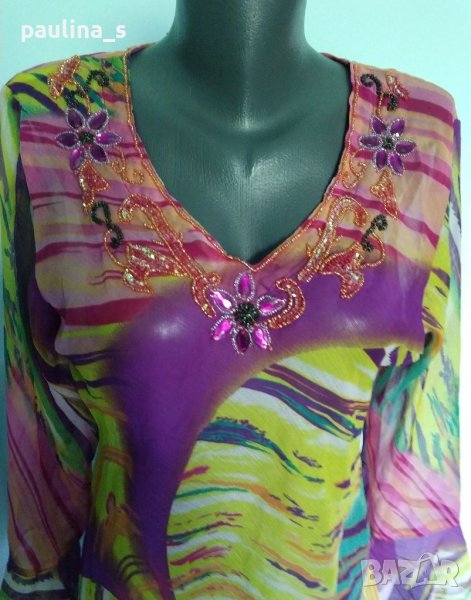 1️⃣. L / 3XL - Уникална индийска туника или рокля с декорации на бието, от ефирна органза. Цената е крайна 34,99лв / 17,5 евро . Материята не е ластична, моделеът е радиална еластичност и пода по тялото от тежестта на коприната. Една бройка, без дефекти.