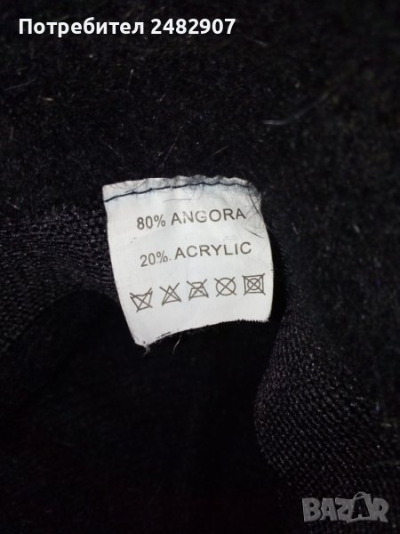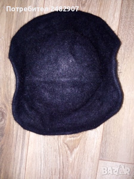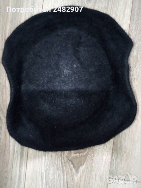 Дамска шапка от ангорска вълна, с връзки. Съдържа 80 % ангора и 20 % акрил. Мека, топла и удобна. Обиколка - 58 см, диаметър на периферията - 33 см. Периферията може да се оформя по различен начин, посредством метален обръч, поставен в нея. Много запазена, отлично състояние, използвана е веднъж.