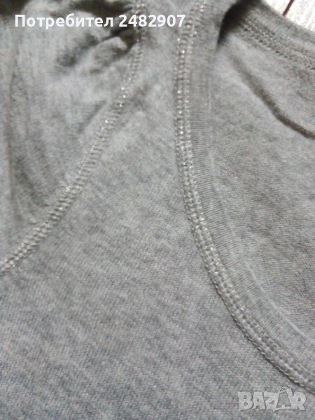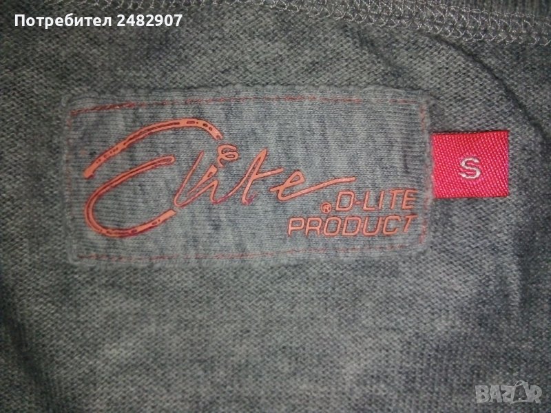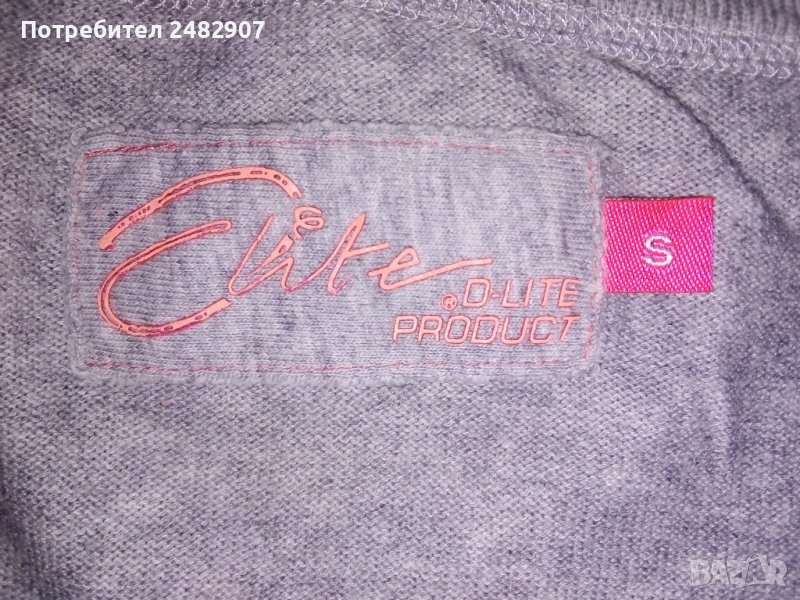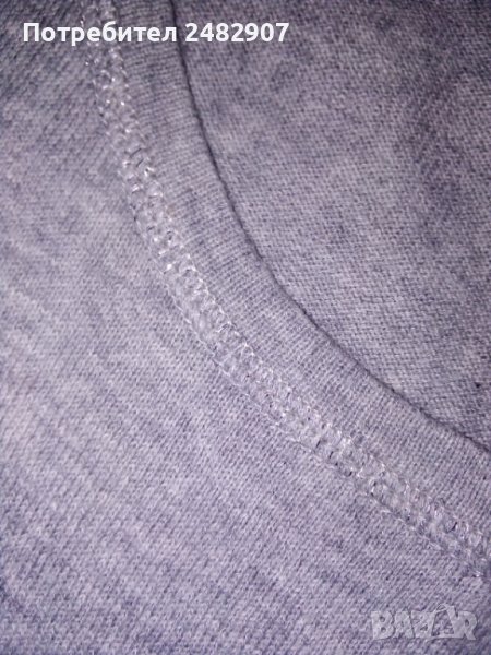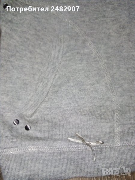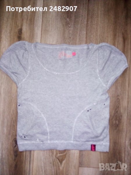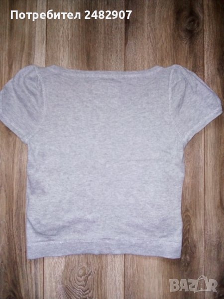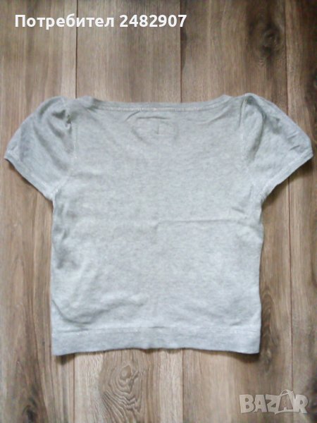 Сива дамска блуза с къс набран ръкав, машинно плетена, размер S. Съдържа 100 % памук и две малки джобчета отпред. Ширина в раменете - 34 см, ширина под мишниците - 42 см, дължина от рамото до долу - 46 см, дължина на ръкава от рамото - 16 см. Много запазена, почти не е използвана.