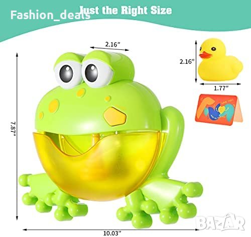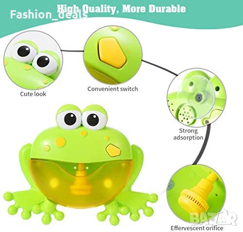 Многофункционална машина за мехурчета с форма на жаба, която може да възпроизвежда музика и е предназначена за деца, които да се наслаждават на времето за къпане. Захранва се с батерии и използва нетоксични материали от ABS пластмаса. Машината за мехурчета произвежда мехурчета по цялото лице на жабата, което има комедиен ефект и кара децата да се кикотят и вълнуват. Тя също така възпроизвежда 12 класически детски стихчета, които могат допълнително да допринесат за забавното изживяване по време на къпане. Играчката има три силни силиконови вендузи, които могат да я закрепят здраво към стената на банята или към стените на ваната.
