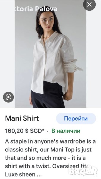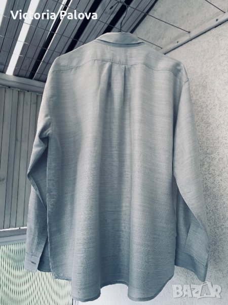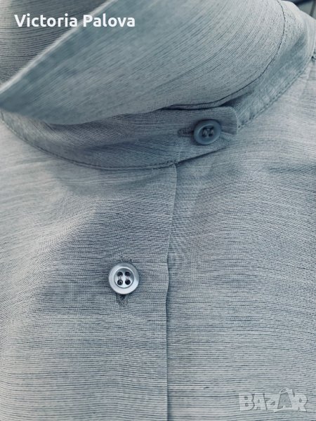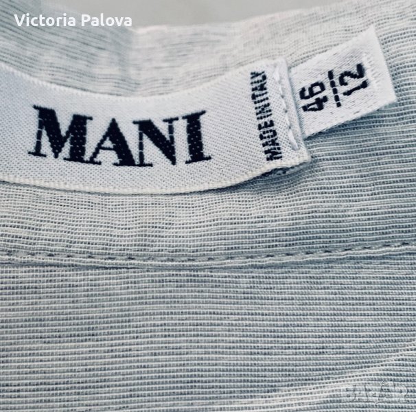 Марката е била представена от Giorgio Armani(Mani) в Америка като по-достъпна ценова алтернатива,след което се разделят.ризата е въздушна,семпла,но красотата ѝ си личи-копчетата,кройка,интересно закопчаване под яката,а и материята е нещо специално-рядко качество на коприна.рамо-52см,ГО-64см,дължина-75см,ръкав-58,5см,объл долен край.