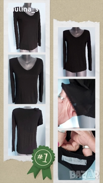 2️⃣. Колаж / L / 3XL - / Made in Italy. Цената е крайна, без пазарлъци 29,99лв / 15 евро. Много еластична черна италианска блуза с дълъг ръкав и декорации от сребърно ламе по краищата. Материята е вискоза и еластан, много еластична и покрива няколко размера, посочени са. Голям размер е, една бройка, нова без дефекти и етикет.