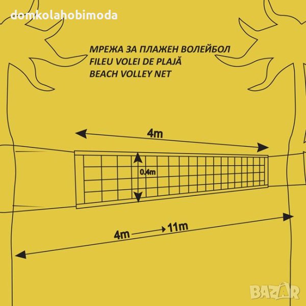 Мрежа за плажен волейбол с чанта за носене и съхранение . С размери4 ширина 40сантиметра височина в комплект със странични въжета с койото достига до 11 метра ширина.