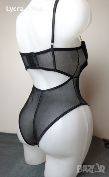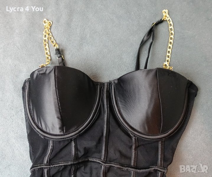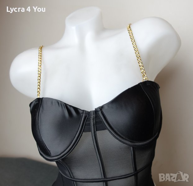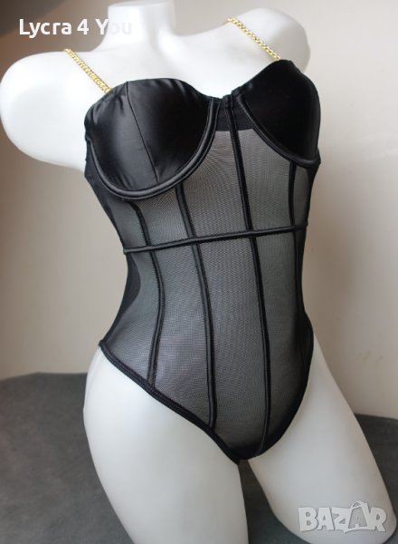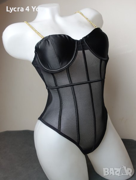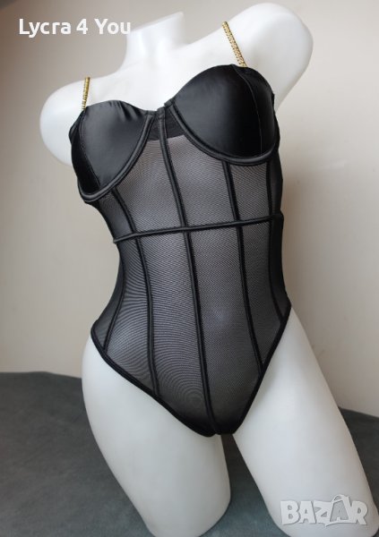 Ново боди, луксозно изпълнение със сатенени меки чашки с вертикални сатенени ленти по цялата дължина и златисти здрави верижки за презрамки. Отзад е тюлено, с черен сатениран кант минаващ по цялата периферия. Моделът е с изрязана бикина тип бразилиана отзад.