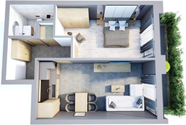 Двустайният апартамент е с площ 77,04 кв.м., с и/з изложение. Състои се от : всекидневна с бокс, спалня , баня с тоалетна, две тераси и коридор. Степен на завършеност БДС, с висок клас дограма, високо ниво на звукоизолация, енергийна ефективност. Възможност за закупуване на гараж или паркомясто.