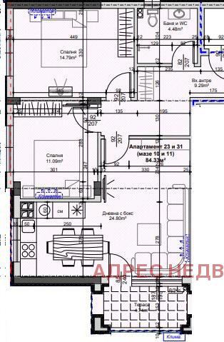 ТРИСТАЕН апартамент с площ от 106 кв. м. Състои се от антре, всекидневна с кухненски бокс, две спални, южна тераса, баня и тоалетна. ТРИСТАЙНИЯТ апартамент ще бъде издаден в следния вид: стени и тавани шпакловка, под замазка, тераси гранитогрес, ел. инсталация до фасунга и ключ, ПВЦ дограма. Възможност за закупуване на гараж или паркомясто.
