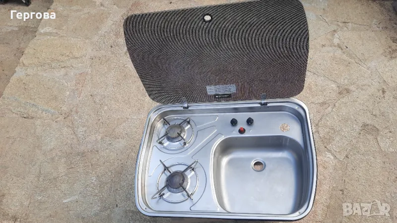 9. Употребявани газов котлон комбиниран с мивка в едно, Dometic HSG 2445. Подходящ за вграждане в тесни пространства в каравана / кемпер / лодка. С две горелки и стъклен термоустойчив капак.