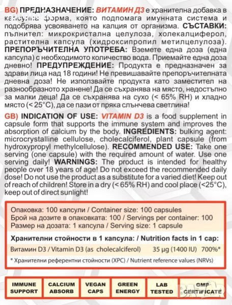 * Витамин Д3 - 35 микрограма (1400IU) - 700%