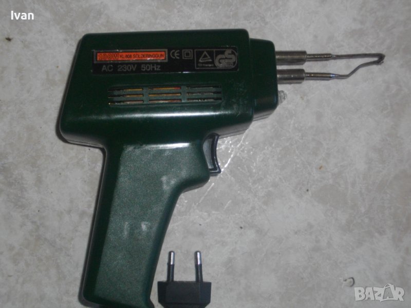 ОПИСАНИЕ на зелен поялник със спусък- 99 лв. Марка и модел KL 808. Чешко или полско произвдство. Индукционен, трънсформаторен. Отлично техническо/работно състояние. Мощност - 100 вата. Човка 50 мм.