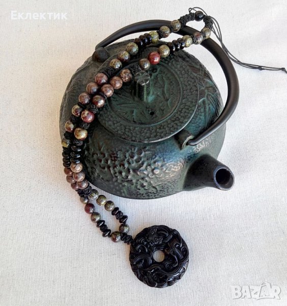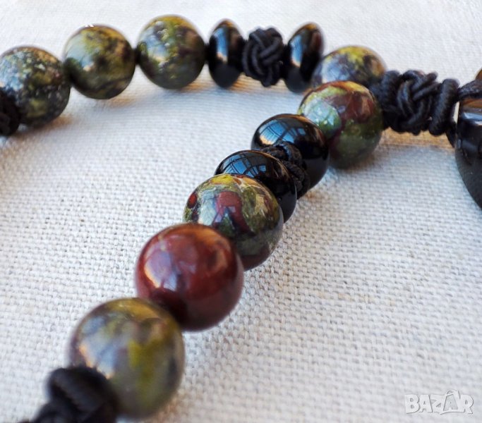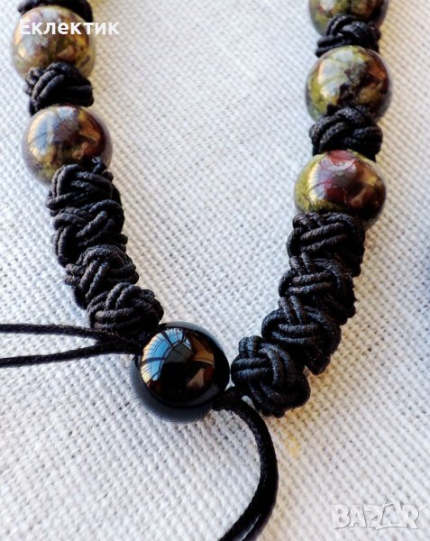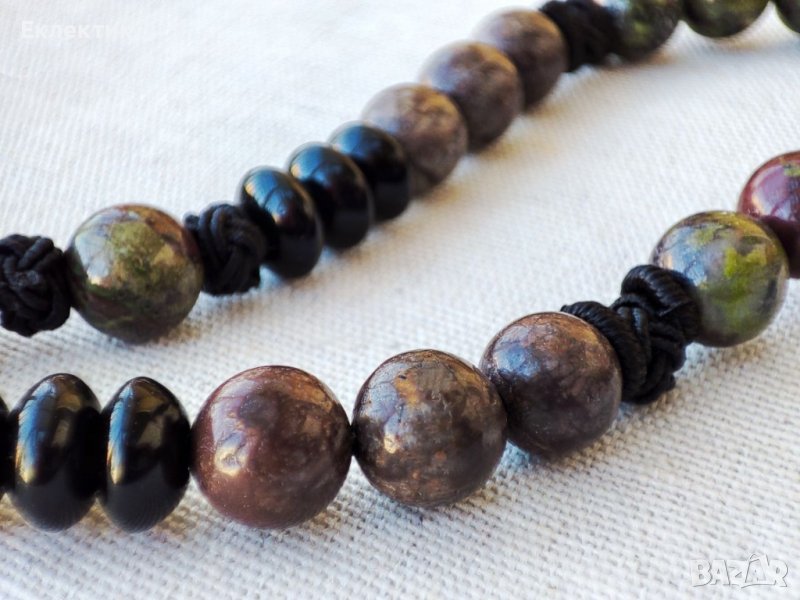 Нанизът включва мъниста от яспис Драконова кръв (8мм), Снежинков обсидиан (8мм), черен оникс (с форма абакус 5х8мм) и микро макраме мъниста от плетена корда, които скриват възлите по двойния найлонов шнур. Герданът е регулируем: от 52 см до 76 см. Общо колието тежи 77.3 гр.