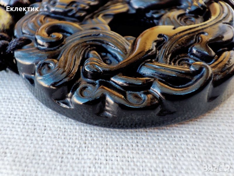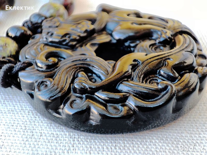 Медальонът представлява диск от гравиран черен вулканичен обсидиан (46,5 ммв диаметър и дебелина около 11 мм, тегло 32 gr). Изобразен е китайски митичен дракон (Pixiu, Qilin, Ruyi Дракон, Тревен дракон и др.).
