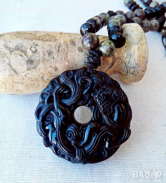 Драконът като цяло носи внушения за сила, смелост, авторитет, късмет, дълголетие, щастие и защита срещу всякаква негативна енергия. Към мистичните сили на този символ се добавя енергията, носена от полускъпоценните камъни. Ясписът Драконова кръв символизира креативност, смелост, сила, адаптивност, състрадание. Помага ни да „пораснем“ в нашия духовен и земен живот и да бъдем способни да поемем повече лична отговорност. Снежинковият обсидиан е камък на чистотата, той осигурява баланс на тялото, ума и духа и разсейва стресовите умствени модели. Самият черен обсидиан носи силни лечебни енергии, най-важни от които са способността му да пречиства и заземява.