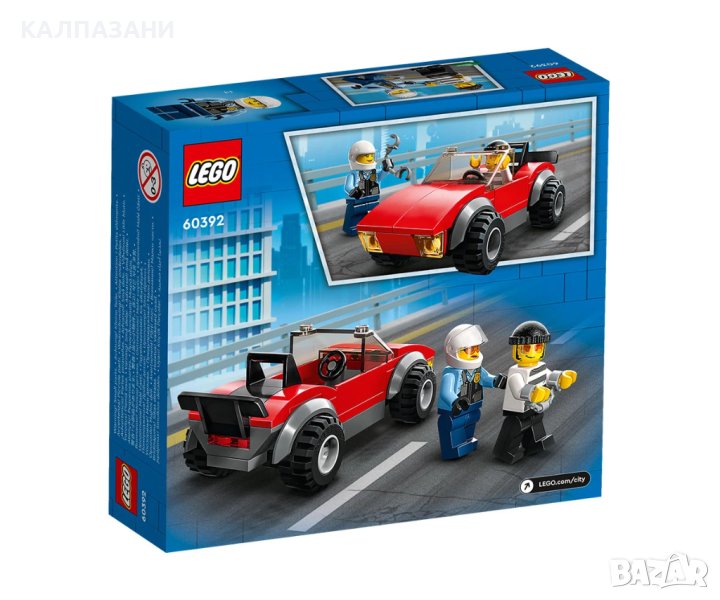 Мобилизирайте въображението на децата с екшън комплекта за игра. LEGO® City Преследване с полицейски мотоциклет (60392) се предоставя с мотоциклет за полицейско преследване и спортна кола за бягство на престъпника. Просто добавете минифигурите на полицая и престъпника, банкнота и капка въображение за часове забавление със залавяне на престъпник. Забавлението се допълва от интерактивно цифрово ръководство за построяване Този комплект 5+ включва печатно ръководство за построяване „стъпка по стъпка“ и приложението LEGO Builder – интерактивно ръководство за построяване, което прави строителството още по-забавно и включва интуитивни инструменти за мащабиране и завъртане, с които децата могат да визуализират всеки модел от всички ъгли по време на конструирането. Играчки, които дават възможност за игра с въображение Комплектите за игра LEGO City поставят децата в центъра на действието, където те решават какви ще са историите, разигравани с многофункционални сгради, страхотни автомобили и вдъхновяващи герои, които стимулират безкрайна ролева игра с въображение.