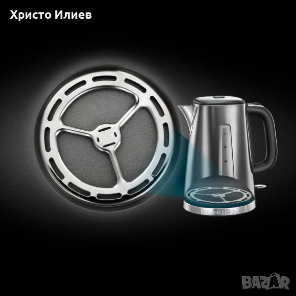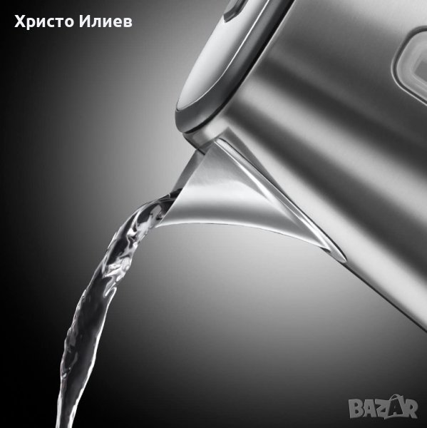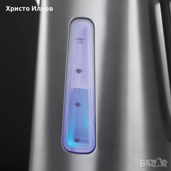 Чучурът с идеална форма предотвратява разливането на водата. Капацитет 1,7 литра със синя подсветка. Въртяща се на 360° основа и място за съхранение на кабела. Скрит нагревателен елемент.