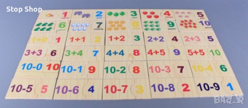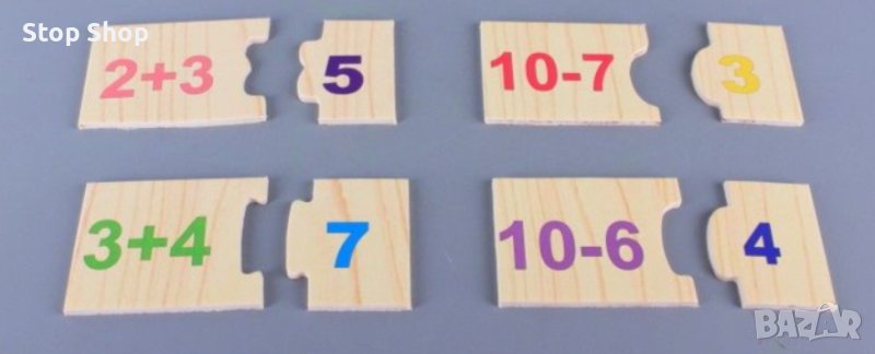 Забавния дървен пъзел Математика съдържа части на пъзел с числата от 1 до 10, части на пъзел с предмети за броене, части на пъзел със задачки за събиране и изваждане, части на пъзел с отговорите на задачките.
