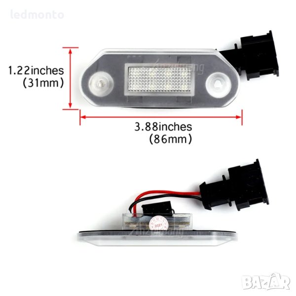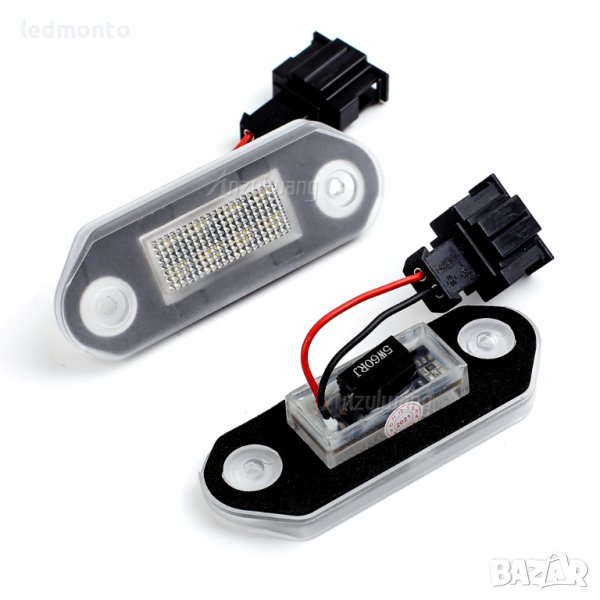 LED плафони светлини за регистрационен номер на автомобил, подходящи за VW Golf 3, Jetta, Gol, Vento, A3, Skoda Octavia и други модели. Комплектът съдържа две високоенергийни LED светлини, които не предизвикват грешки в системата на автомобила. Всяка светлина е оборудвана с 18 броя светодиоди, които осигуряват ярка светлина в бял цвят (6000-6500К).