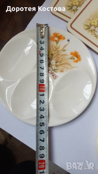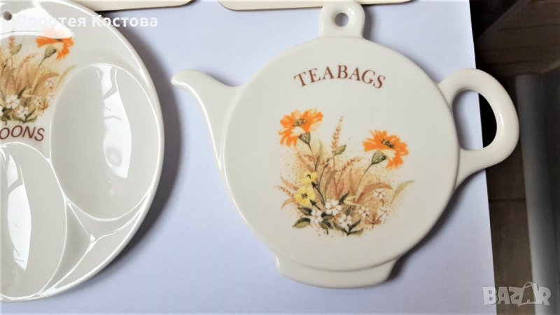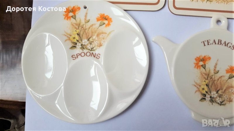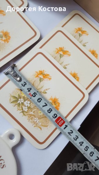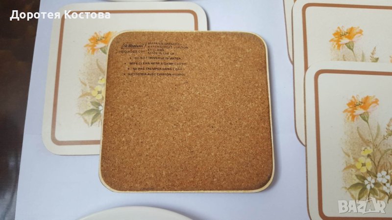 MARKS AND SPENCER красив комплект с полски цветя от Англия, включва подложка, поставка за лъжици, поставка за пакетчета от чай и 5 подложки за чаши. Размерите са на снимките, в много добро състояние са. Цена за всичко - 40 лв. Подложката е продадена.