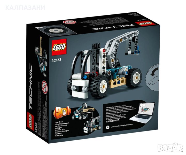 Телескопичният товарач е герой на строителната площадка с множество умения и е перфектната машина за повдигане и преместване на тежки товари. Сега можете да създадете своя LEGO® Technic Телескопичен товарач. Забавлявайте се много при построяването и изследването на всички чудесни функции на телескопичния товарач. След това, за ново предизвикателство, преустройте модела си в страхотен влекач с кормилно управление и кран с повдигащо рамо. Децата на възраст 7+ години, обичащи играчки за конструиране и влекачи, може много да се забавляват с този комплект за строителство „2 в 1“. Моделът за конструиране LEGO® Technic Телескопичен товарач (42133) е с реалистични характеристики като кормилно управление, подемно рамо и накланящи се вилици. Има и сглобяем палет за повдигане, така че децата могат да играят различни роли в приключения на строителен обект. Модел „2 в 1“ Има много неща, които да задържат вниманието на децата с този забележителен комплект за сглобяване, защото моделът Телескопичен товарач се превръща във влекач с кормилно управление и подемен кран. Учене чрез игра Комплектите за конструиране на LEGO Technic се отличават с реалистично движение и механизми, които въвеждат младите строители на LEGO във вселената на техниката по достъпен и реалистичен начин.