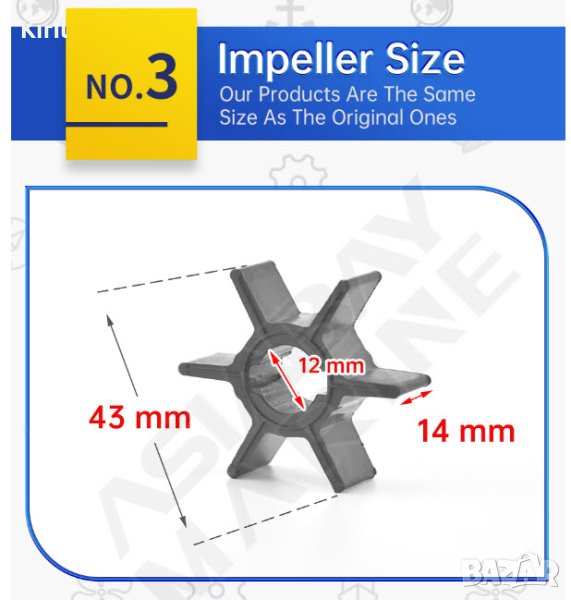 ВОДНА ПОМПА ИМПЕЛЕР  за TOHATSU Nissan 2,2/2,5/3,3/3,5hp вал 14 н14 диа 43мм 309-65021 → Обява 40585930