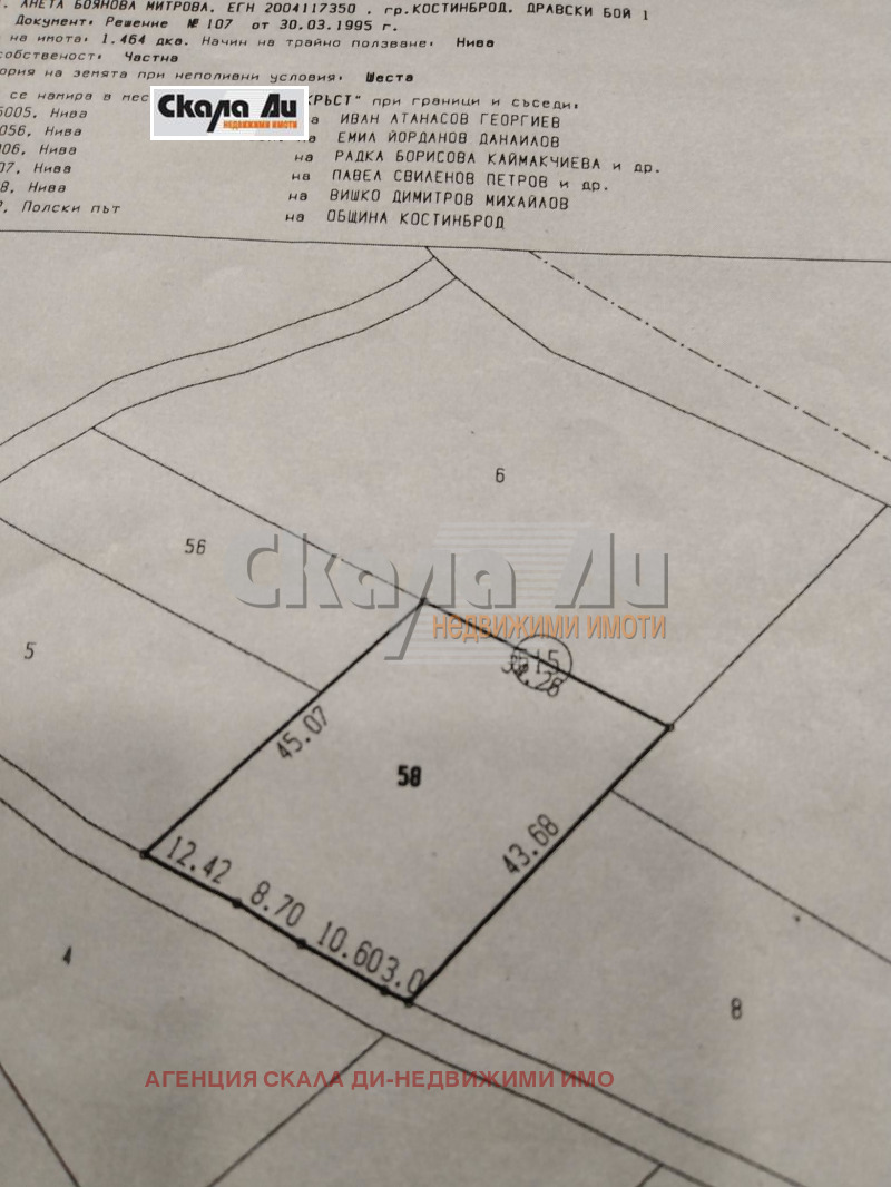 АГЕНЦИЯ 'СКАЛА ДИ' продава Земеделска земя 58 до гр.Костинброд в землището на с. Шияковци. Парцела се намира до Ломско шосе по пътя за с.Драговищица.