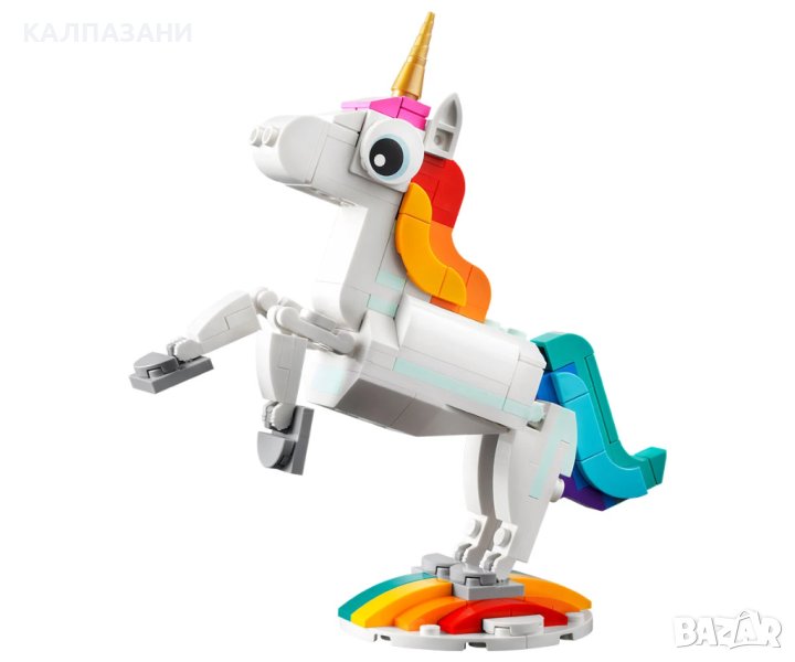 Децата с въображение на възраст над 7 години могат да бъдат пренесени в митична земя за завладяващ екшън със строителния комплект „Магически еднорог „3 в 1“ (31140)“. Включва еднорог със златен рог, цветна опашка и подвижни крака и копита. Може да бъде представен в 2 различни позиции: изправен на 4 крака или вдигнат на 2-та си задни крака за емблематична поза и изложен на показ на стойката с дъга от комплекта. Постройте цветни животни от тухлички на LEGO® Митичният екшън никога не спира с 3-те различни магически същества, които малките строители могат да сглобят в комплекта LEGO Creator „3 в 1“. Те могат да построят подвижен магически еднорог, да го превърнат в подвижно морско конче със стойка с морско дъно, да го превърнат в подвижен магически паун с цветна опашка или дори да използват тухличките, за да създадат друго пленително създание. Приложение LEGO Builder Изтеглете приложението LEGO Builder и влезте в нов свят на забавно конструиране, където децата могат да мащабират и завъртат модели в 3D, да записват комплекти и да проследяват напредъка си.