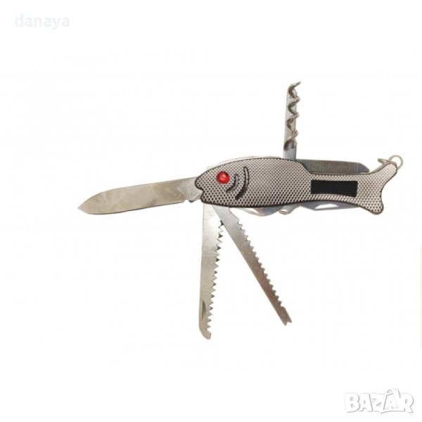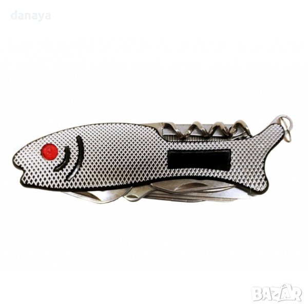 Многофункционален survivor аксесоар. Швейцарски джобен нож с форма на риба. Мултифункционален туристически аксесоар с джобни размери. Перфектен подарък за хора, обичащи да прекарват свободното си време сред природата.