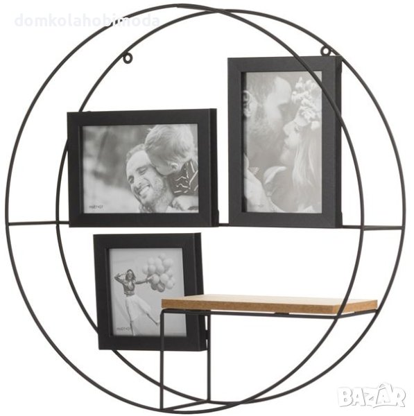 Кръгла метална рамка за снимки в черен цвят с дървена декоративна полица и място за 3 снимки.