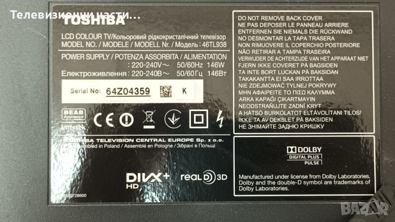 Toshiba 46TL938 със счупен екран - LTA460HW04/PE1091 V28A001434C1/V71A00022901/12PSQBC4LV0.0/SSL460