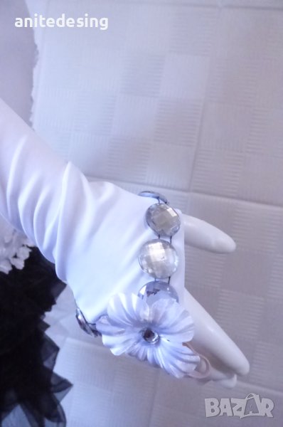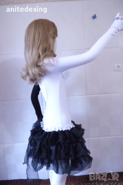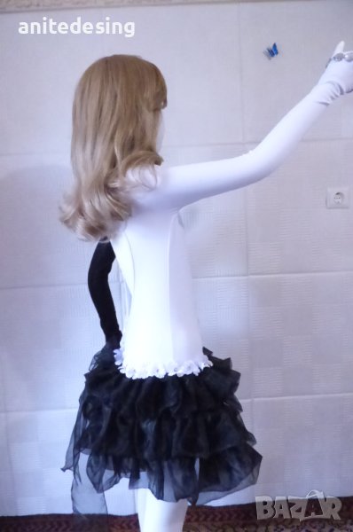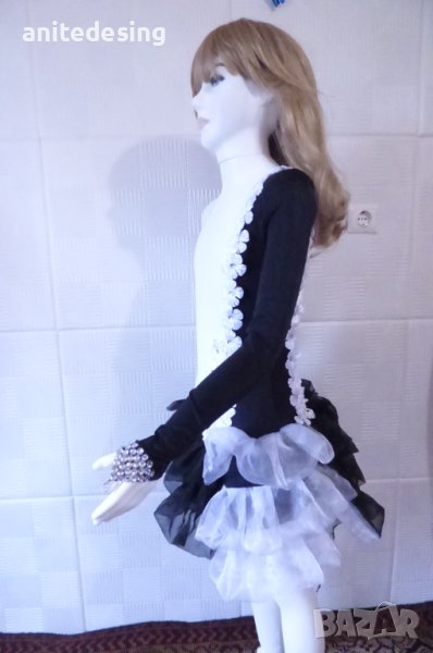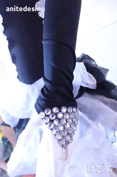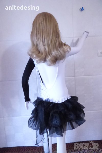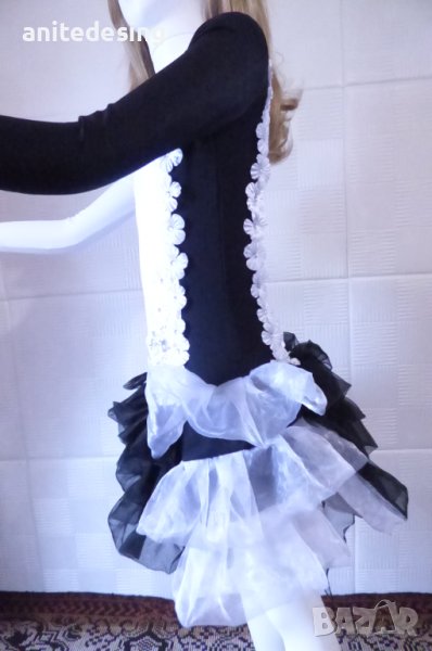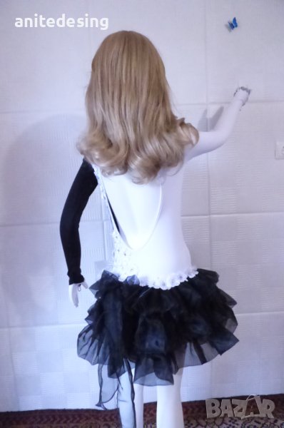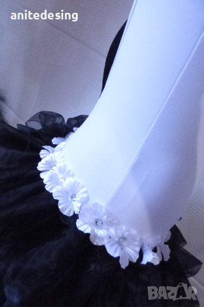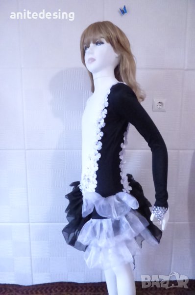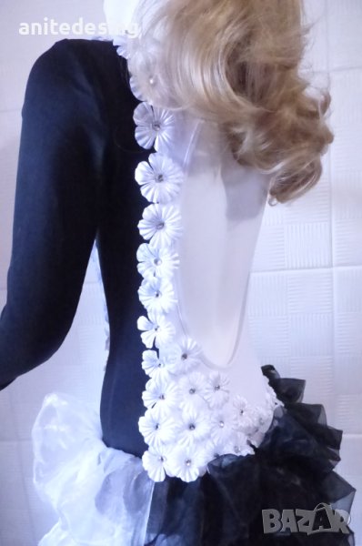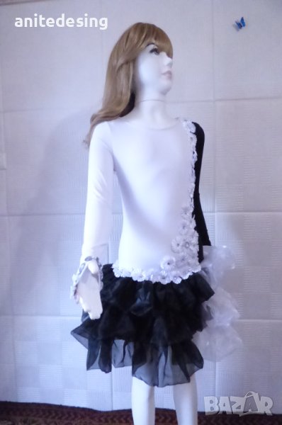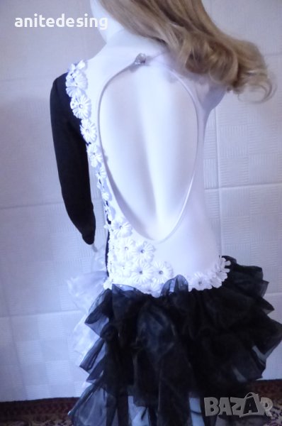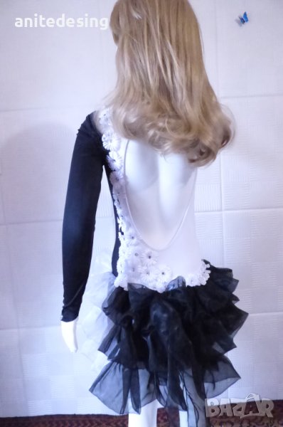 Рокля за спортни танци ,комбинация между черно и бяло ,изработена от полиестер с еластан, органза ,копринени цветя,кристали ,роклята е подходяща за дете с височина от 134 до 146.