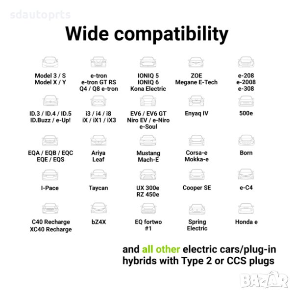 GC кабелът е съвместим с всички електрически автомобили и хибриди, оборудвани с щепсели тип 2, включително Tesla Model S / Model X / Model 3, BMW i3, Audi E-Tron, Nissan Leaf, Renault ZOE, Toyota Prius Plug-In, Hyundai Kona / IONIQ, Kia Niro и др.