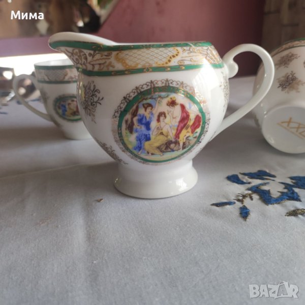 Налични два броя канички за мляко от много фин костен порцелан с маркировка - цена за броя 20 лева. Три броя чаши без чинийки от костен порцелан - цената за един брой чаша - 15 лева