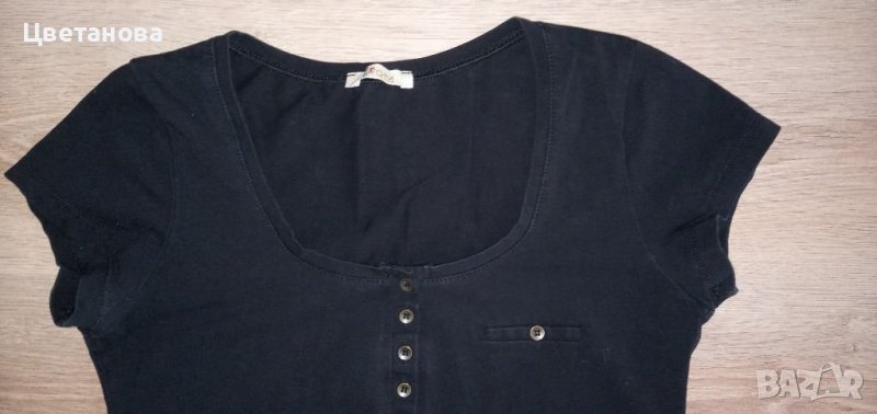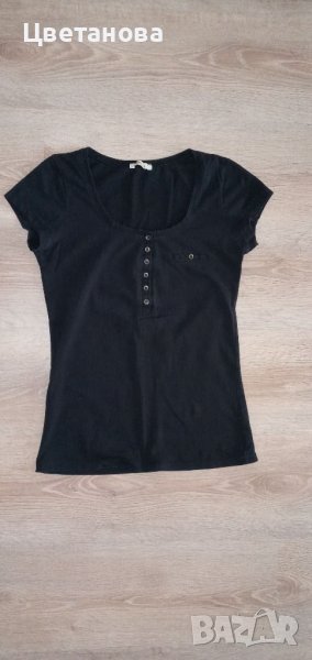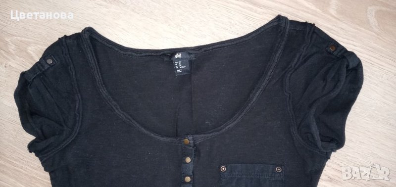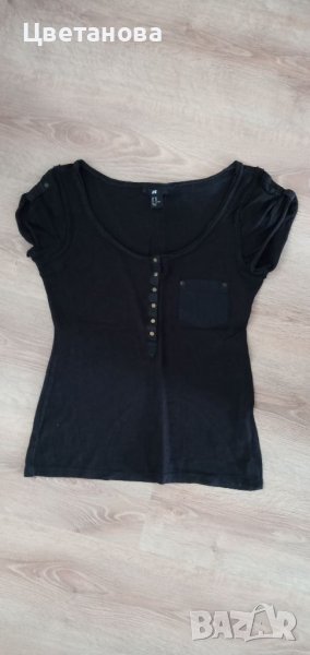 1.Черна блузка( тениска) с джобче и копченца на H&M. Състав 100% памук. Размер по етикет XS, отговаря на S (36).