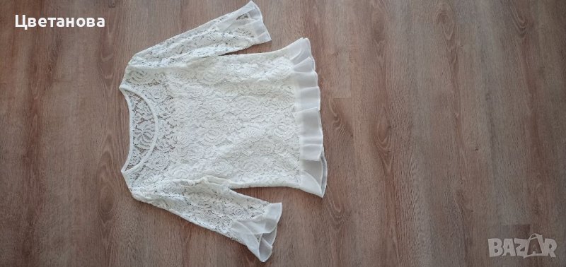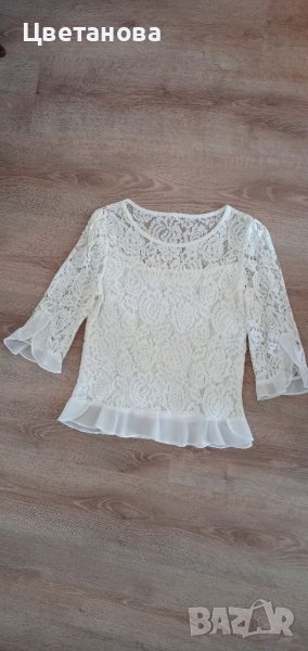 Бяла блуза от дантела с волани и подплата от шифон. Не обличана, само изпрана. Размер S/М. Цена 10 лв.
