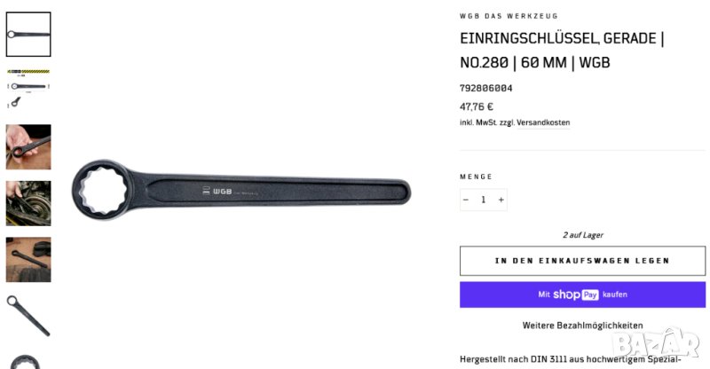 • АРТИКУЛ: Оригинал WGB Професионален Германски Инструмент Силов Удължен Гаечен Ключ ЗВЕЗДА 60мм с ръкохватка; (Cr-V Forged Steel WGB Industrial Heavy-Duty Single Ended 12-Point Ring Spanner Wrench 60 mm DIN 3111);
