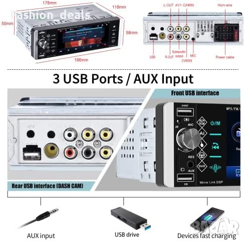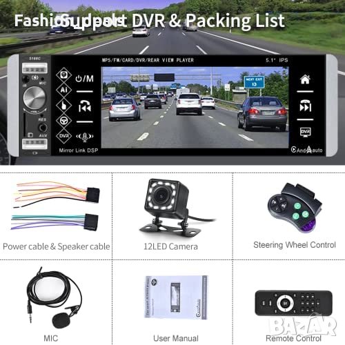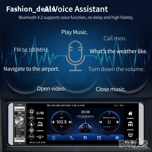 Автомобилна стереосистема с един дин с Apple Carplay и Android Auto за лесен достъп до функциите на телефона, навигацията и гласовия асистент.