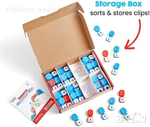 Включва 45 щипки за малки букви, 4 щипки за точки и ръководство за дейности (само на английски език)