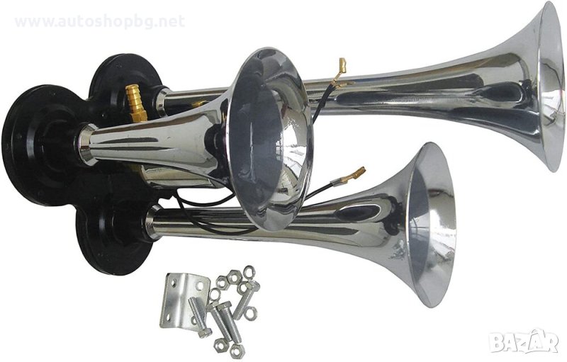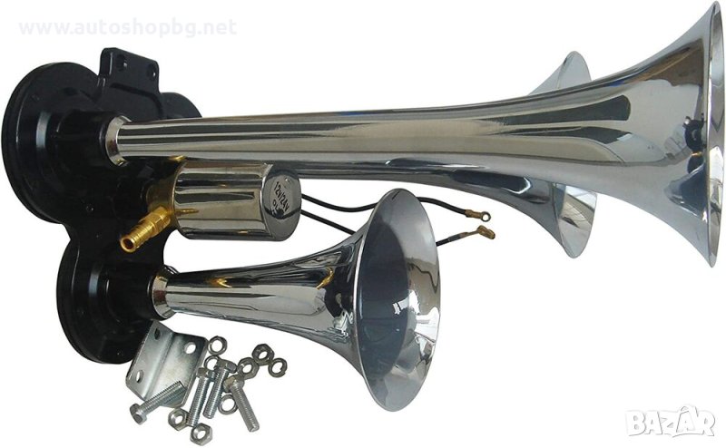 Тройна тромба 12V 24V за Камион ТИР Бус Описание: - Дължина: 1 рог x 290 mm, 1 рог x 230 mm и 1 рог x 170 mm - Напрежение: 12V / 24V - Силно: 125 Db - Налягане: 3-10 бара - Хромиран метал (не пластмаса) - Включен Електромагнитен клапан - Включени Монтажни болтове и гайки - Работи с въздушен компресор за подаване на сгъстен въздух!