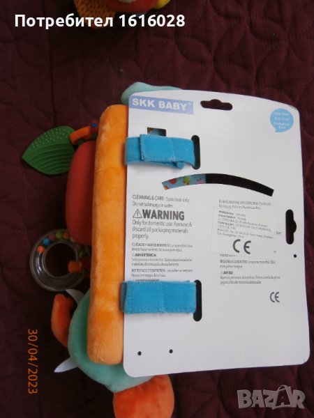 1.Двете големи комбинирани играчки слон и маймунка,могат да се закачат на кошара или на дръжката на количка.Ушите им шумолят,има дрънкалка с топчета,дъвкалка за зъбки и пласмасова торбичка в която могат да се пускат други малки играчки.