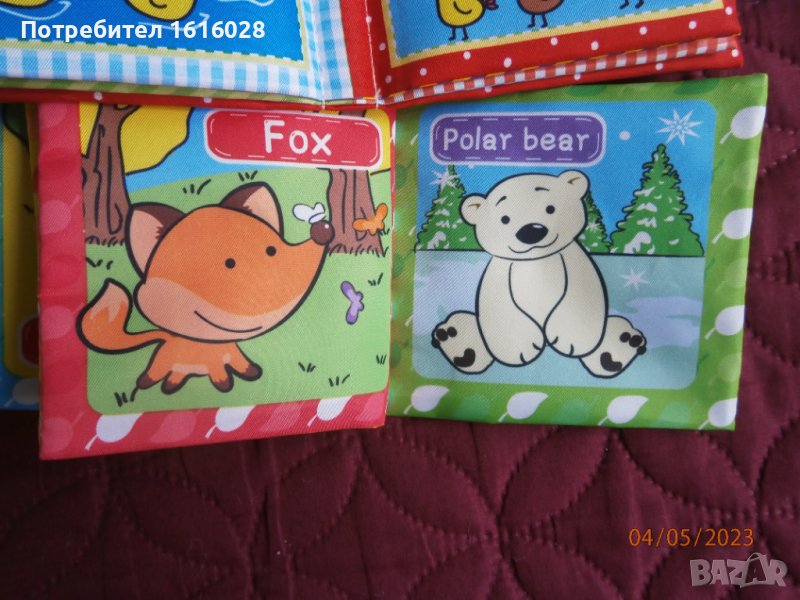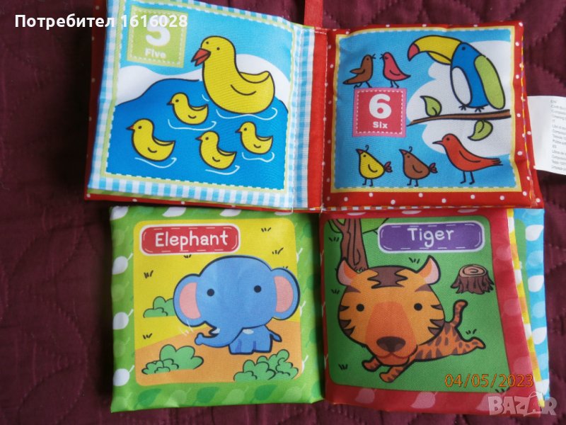4.Меките книжки подходящи за бебета,и стават и за по големи деца.Външните корици шумят,има цветни красиви странички с животни.Подходящи са и за деца в детската градина,които започват да учат английски,да научат цифрите на английски от 1 до 10,както и някои от животните как се произнасят на английски.
