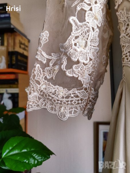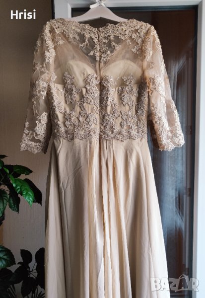 Разкошна карамелено бронзова или по скоро в цвят тъмно шампанско рокля JJ'S House за повод. Нова, с етикет. Дантелен торс, обшит с пайети, 7/8 ръкав, надолу тялото се облива от шифон с подплата. Има вшити леки, оформящи подплънки, за страхотен силует. Размер 10, отговаря на М. В сайта вече е изчерпана.