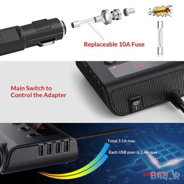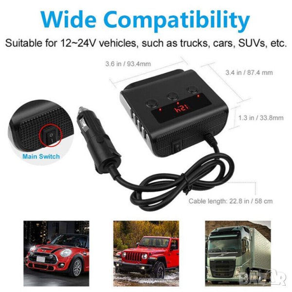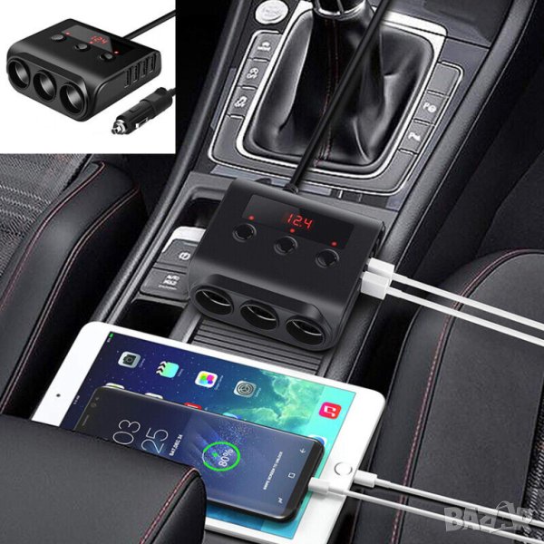 Висококачествен разклонител за автомобилна запалка 12/24 волта с три гнезда, 4 USB изхода и дисплей.Разклонителите за автомобилни запалки са едно изключително полезно и важно приспособление. Този висококачествен разклонител за запалка за автомобил ви дава достъп до няколко допълнителни порта. С негова помощ ще можете да зареждате мобилния си апарат като едновременно използвате навигацията, без да се лишавате от работещата запалка. Четирите USB порта позволяват едновременно зареждане на четири телефона, което е предимство както за водача на автомобила, така и за неговите пътници. Разклонител за запалка е идеално приспособление, което отговаря напълно на нуждите на всеки съвременен човек. Той позволява едновременно захранване на до четири устройства по време на движение през USB портовете - смартфони, таблети и GPS навигационни системи, както и осигурява цели три гнезда за запалка. Ако държите купето на вашия автомобил да запази своята визия по време на път, то този разклонител за автомобилна запалка е идеалното решение за вас. Той изпъква с елегантния си и семпъл дизайн, а захранващият кабел е достатъчно дълъг - 56 см, за да се избере най-удобното място за зареждане, спрямо нуждите и предпочитанията на водача и неговите пътници.