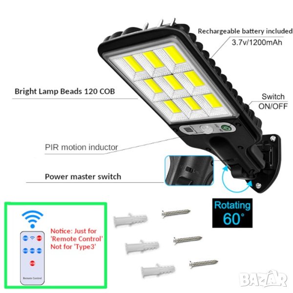 Лампата е с вградени мощни COB светодиоди. Осветява безпроблемно Вашата градина, барбекю, тераса и други. Зарежда се чрез вграден соларен панел през деня и работи през нощта. С три режима на работа. В комплекта има включена стойка за монтаж с регулиране на ъгъла.