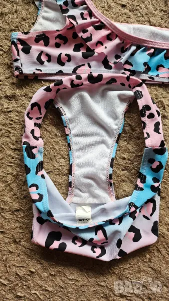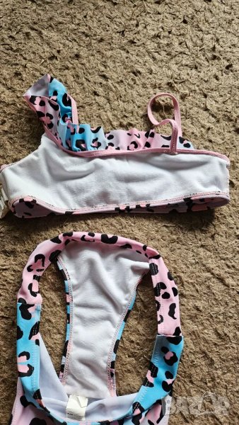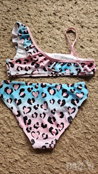 Бански за момиче, половинки на Sinsay, с актуален животински принт и модерно горнище. Дълбочина на долнището 22 см., ширина на горнището 33 см. Обличан броени пъти, в отлично състояние. По етикет е размер 146-152, но подходящ за ръст до 140-146 см.
